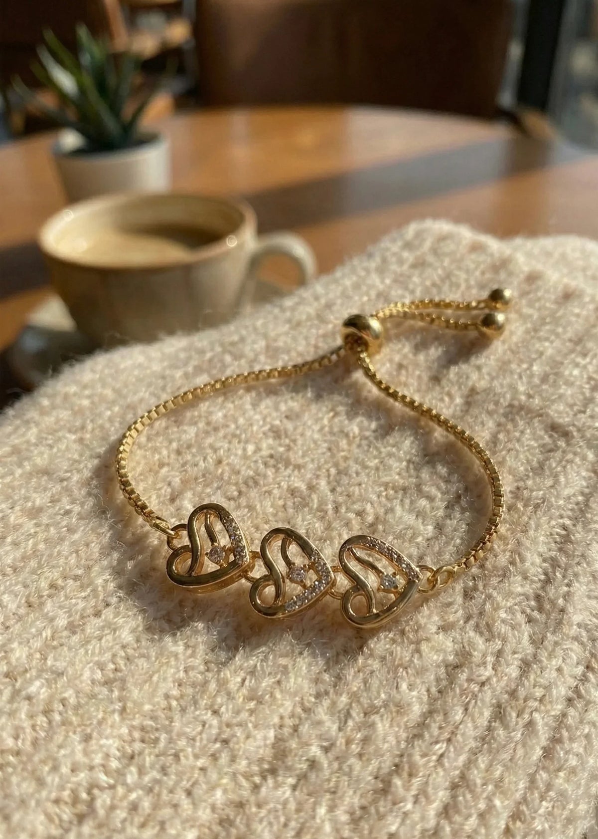 Add a touch of love and elegance to your style with this beautiful Triple Heart Bracelet from Astra Jewels. Designed with three delicately crafted heart charms adorned with sparkling crystals, this bracelet represents love, connection, and timeless beauty. The rich gold finish gives it a luxurious and graceful look, perfect for everyday wear as well as special occasions.