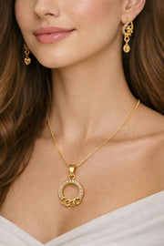 Enhance your everyday style with this elegant gold-plated jewellery set featuring a beautifully crafted circular pendant necklace paired with matching designer drop earrings. The pendant is accented with sparkling crystal stones and artistic ring detailing, giving it a modern yet classy look.