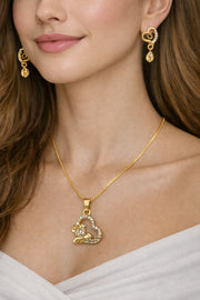 Add a touch of elegance and romance to your everyday look with the Golden Heart Bloom Pendant Set. This beautiful jewellery set features a delicate heart-shaped pendant adorned with sparkling stones and a charming floral motif, paired with matching drop earrings. Crafted in a premium gold-tone finish, this set is perfect for daily wear as well as special occasions. Its lightweight and mini design ensures comfort while enhancing your style with a graceful, feminine appeal.